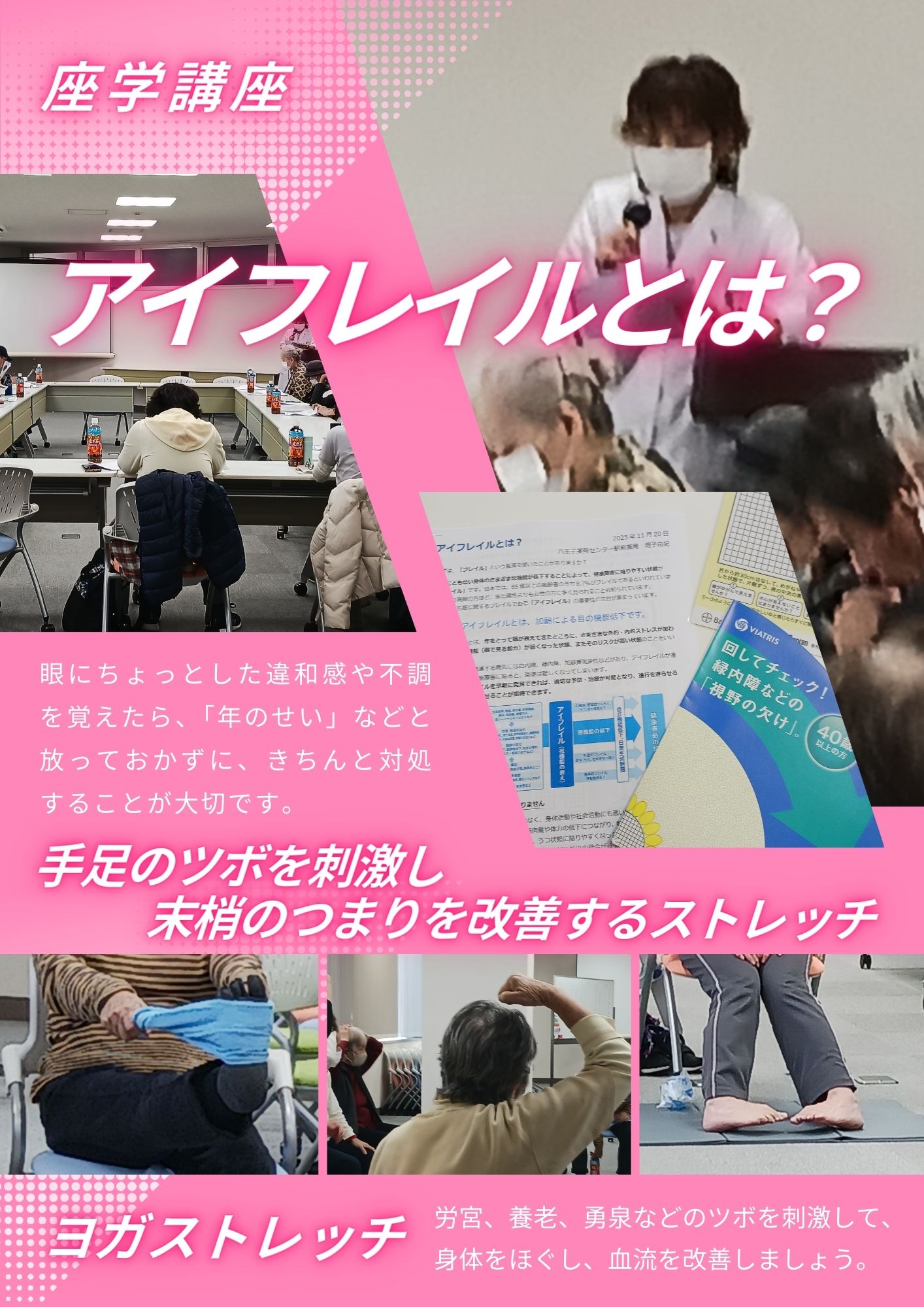 | 共催 | 主催:NPO法人ニューイング 共催:八王子薬剤センター駅前薬局、NPO法人八王子市レクリエーション協会 健康講座の動画はこちらから |
