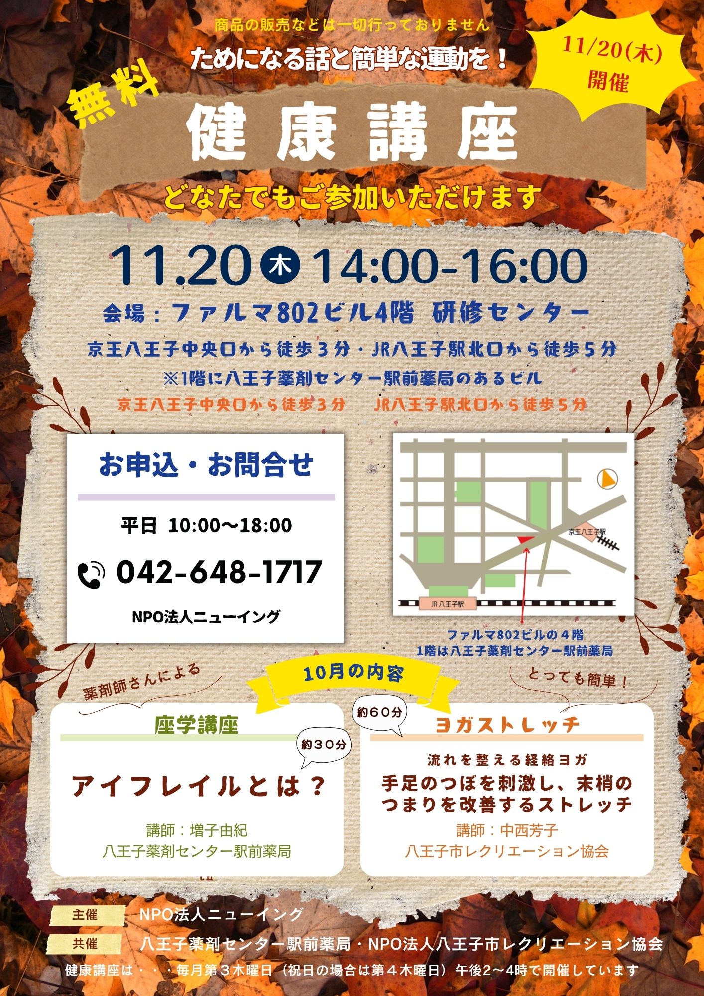 共催 | 主催:NPO法人ニューイング 共催:八王子薬剤センター駅前薬局、NPO法人八王子市レクリエーション協会 健康講座の動画はこちらから |